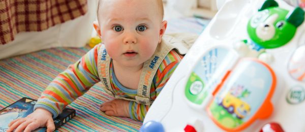 a smiling baby is held in an adults hands